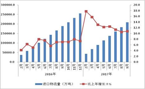 ---進口物流需求量穩中有升。在需求回暖、大宗商品價格回升及等因素帶動下,前三季度國際物流需求穩中有升。1-9月進口物流總額7.2萬億元,同比增長10.8%,增速比上年提高3.7個百分點,年內預計可保持10%左右的增長。